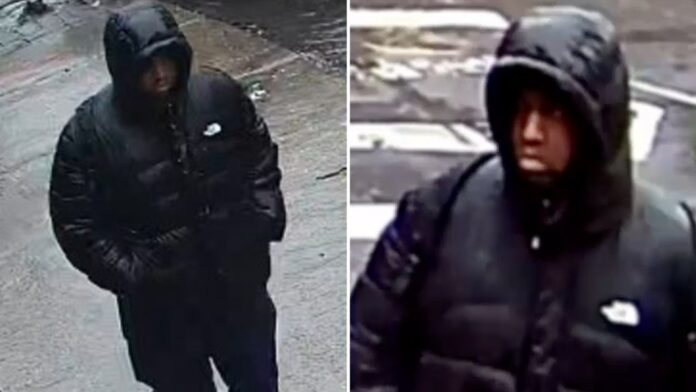Police recovered surveillance footage of the suspect, his face partially obscured by his hood, near the scene.