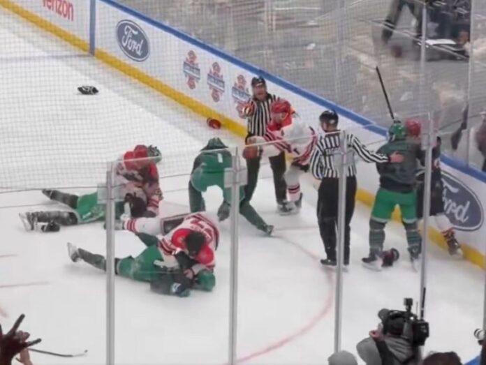 Several players dropped the gloves and both benches emptied, creating chaos on the ice as punches were thrown by both sides.