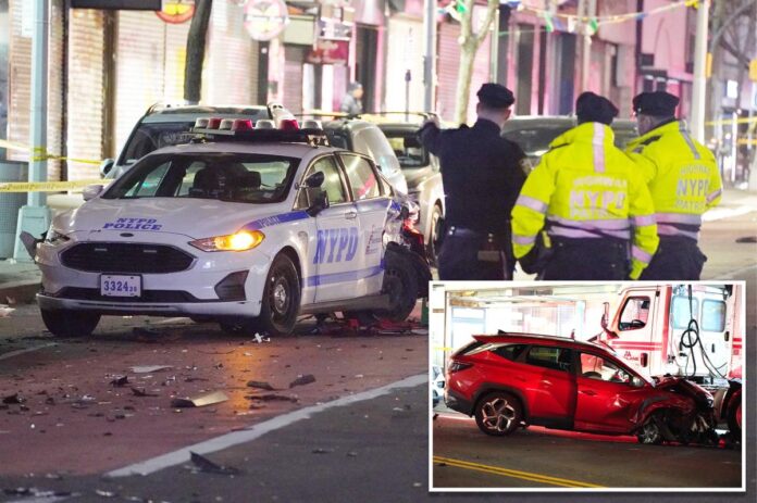 A man, 49, driving a Red Hyundai Tucson ran over two male pedestrians and barreled into a parked NYPD cruiser in the area of West 125th Street and Frederick Douglass Boulevard at around 8:05 p.m., police said.